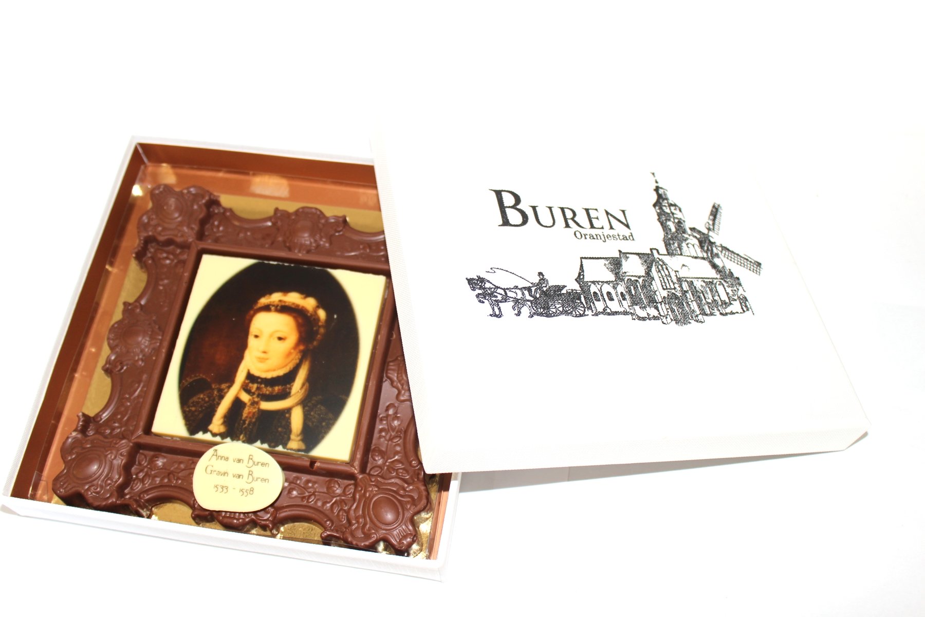 08-03-2024 - World of Chocolate en Koffie & Kunst hebben samen een prachtige Burense geschenkdoos ontworpen en laten maken. Een doosje van ongeveer 17 cm x 17 cm met een linnenstructuur in de kleuren zwart en wit met een kenmerkende Burense afbeelding bovenop het doosje.