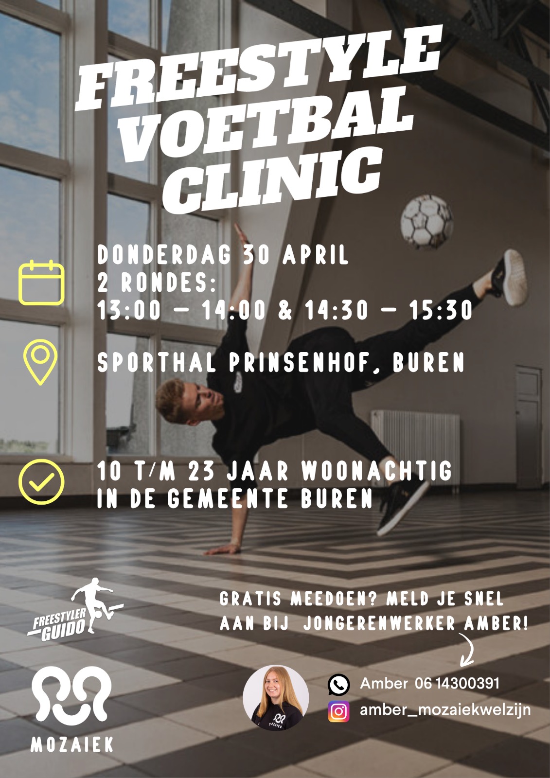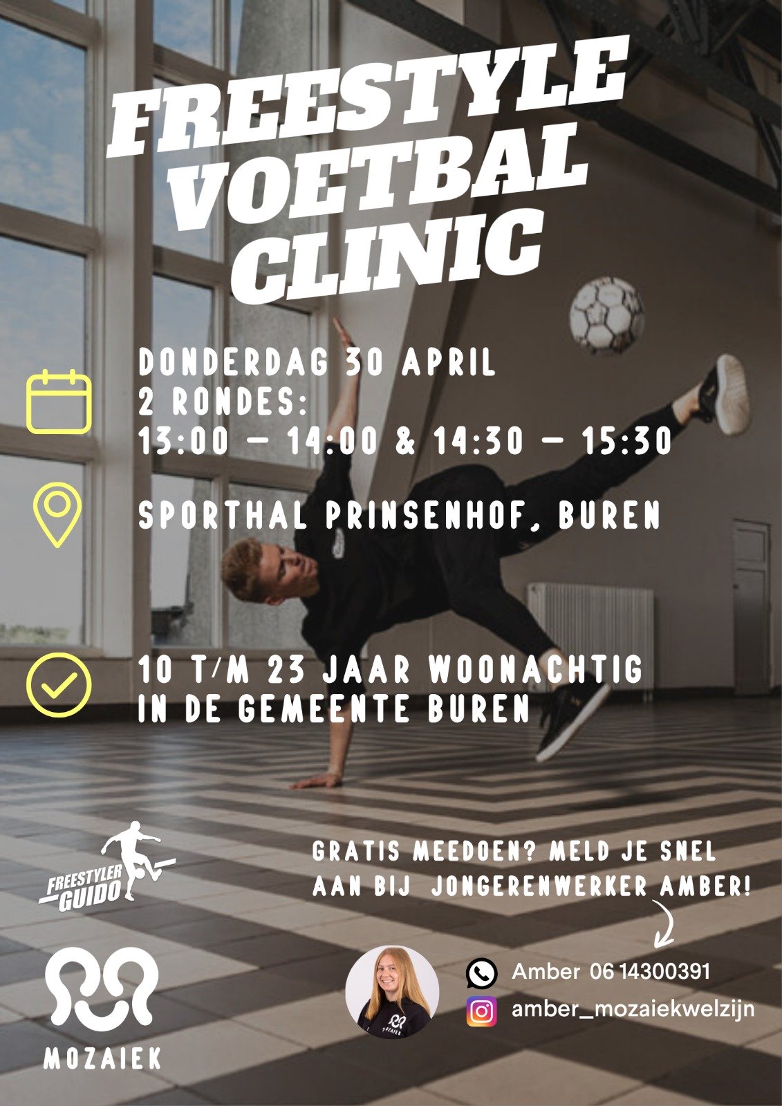 Op donderdag 30 april wordt sporthal Prinsenhof in Buren omgetoverd tot het decor van een spectaculaire freestyle voetbalclinic! Ben jij tussen de 10 en 23 jaar en klaar voor actie en spectaculaire trucs? Dan is dit jouw moment!