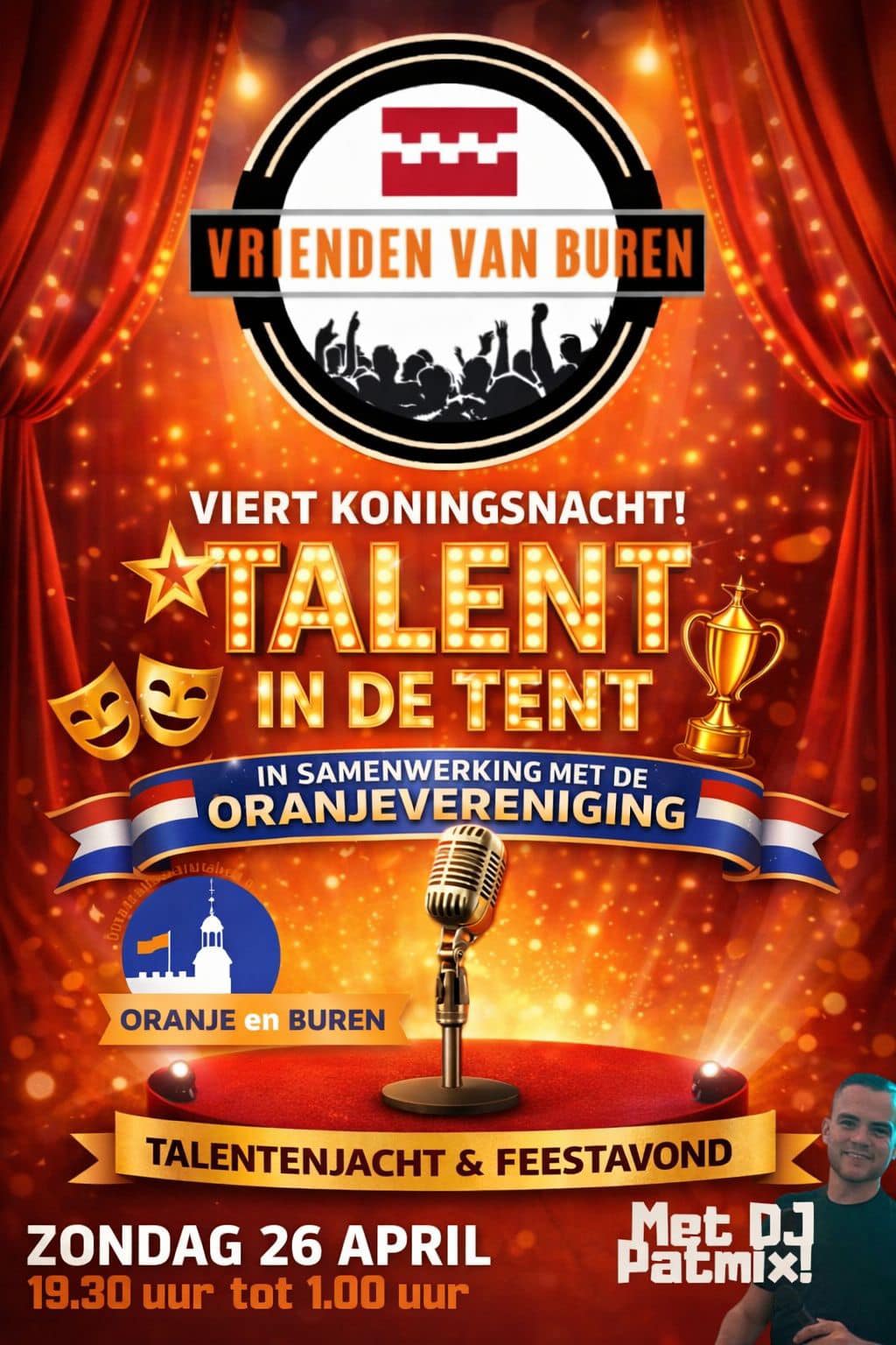 Op zondag 26 april toveren we het Plantsoen in Buren om tot hét podium voor lokaal talent tijdens een geweldige talentenjacht & feestavond!